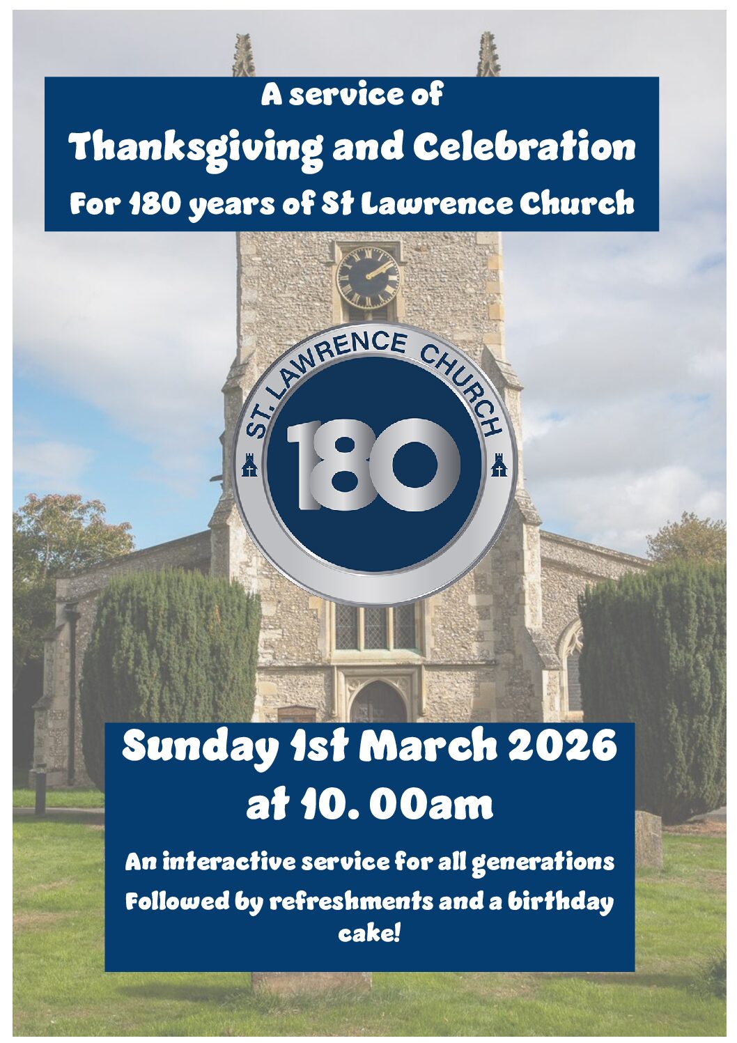 180 Years service at St Lawrence Posted on 14/02/202614/02/2026 by Helen Campbell 180 service poster Posted in St Lawrence Church Bovingdon News.